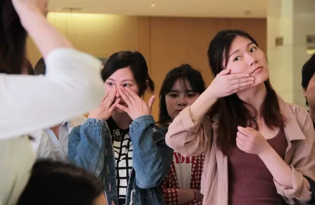 “ 将手张开,食指从鼻孔下往耳边提拉,